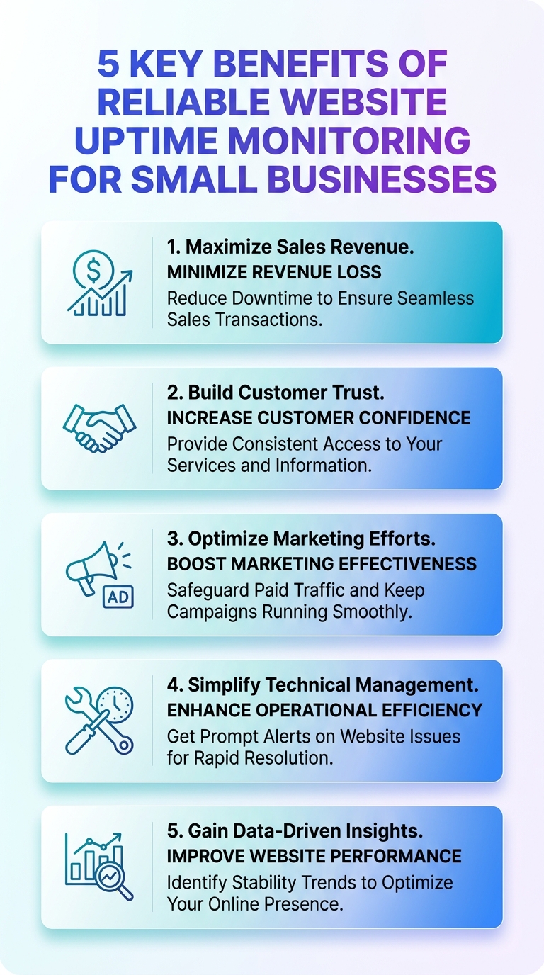 A quick visual guide to the five benefits of reliable uptime monitoring for small businesses. See how the right tools protect performance, reduce downtime, and boost customer trust.
